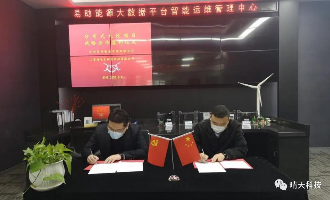 2020年3月9日上午,江蘇晴電太陽能科技有限公司與蘇州易助能源管理有限公司正式簽署了《分布式光伏項目戰(zhàn)略合作協(xié)議》。
