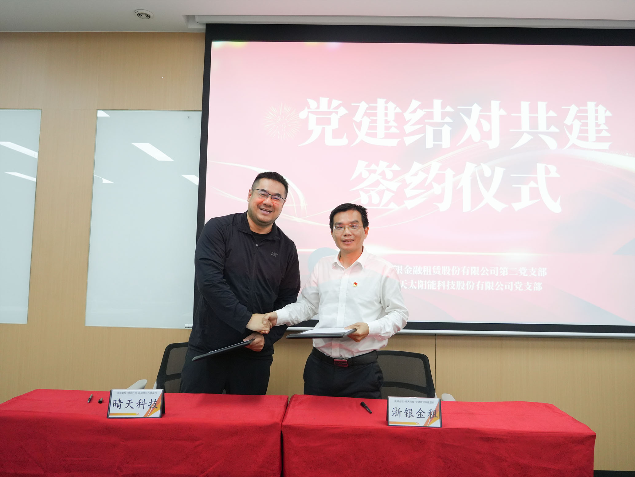 此次黨建共建標(biāo)志著晴天科技與浙銀金租的合作邁入新階段。晴天科技與浙銀金租的黨建結(jié)對(duì),有助于雙方持續(xù)深化合作,通過(guò)資源共享、優(yōu)勢(shì)互補(bǔ),實(shí)現(xiàn)兩個(gè)黨支部之間的深度交流。也期待雙方能在全面推進(jìn)中國(guó)式現(xiàn)代化建設(shè)的新征程上,促進(jìn)“雙碳”目標(biāo)與鄉(xiāng)村振興戰(zhàn)略進(jìn)一步融合,為實(shí)現(xiàn)共同富裕注入強(qiáng)勁動(dòng)力。