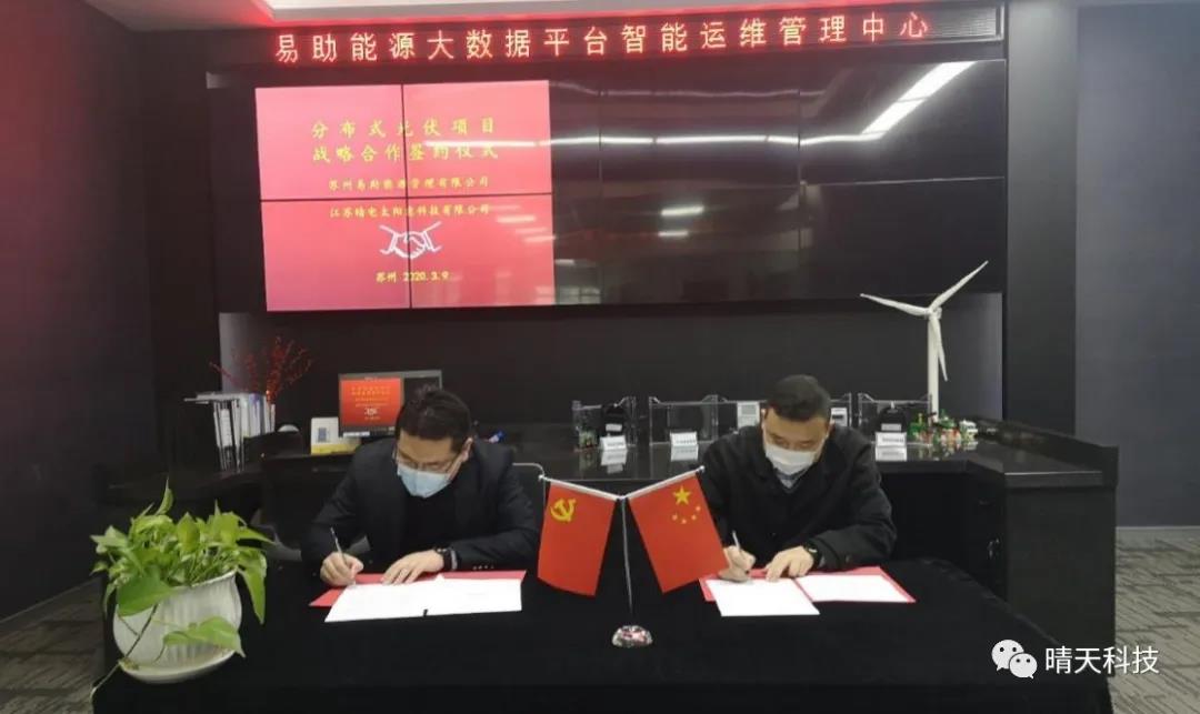 2020年3月9日上午,江蘇晴電太陽(yáng)能科技有限公司與蘇州易助能源管理有限公司正式簽署了《分布式光伏項(xiàng)目戰(zhàn)略合作協(xié)議》。江蘇晴電太陽(yáng)能科技有限公司總裁張總、蘇州易助能源管理有限公司董事長(zhǎng)袁總代表雙方公司簽約。簡(jiǎn)單的簽約儀式上張總和袁總共同表示,雙方將在新能源項(xiàng)目開(kāi)發(fā)、工程承包、智能運(yùn)營(yíng)管理和光伏電站檢測(cè)等多領(lǐng)域開(kāi)展深度戰(zhàn)略合作,共同發(fā)展,互利共贏。
