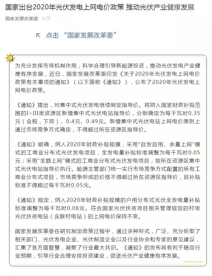 2020年4月2日,國家發(fā)改委在官方微信上,《關于2020年光伏發(fā)電上網(wǎng)電價政策有關事項的通知》(以下簡稱《通知》),公布了2020年光伏發(fā)電上網(wǎng)電價政策。